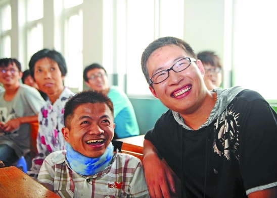 『光光哥,我来抱你!』这是翁建光心底最温暖的记忆,上下课抱着,上厕所抱着,打饭帮着打……李阳每天抱起70斤的翁建光还真累,比如计算机课教室在五楼,等到李阳把他安顿下来,常常累得满头大汗,手臂发酸。时间长了,李阳也有经验,只要翁建光小板凳一动,李阳就知道他要上厕所了。