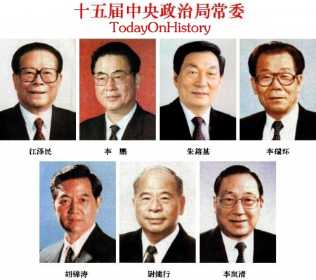 1997年9月19日,中国共产党第十五届中央委员会第一次全体会议在北京举行。出席会议的有中央委员191人,候补中央委员151人。江泽民同志主持会议并作了重要讲话。中共十五届一中全会结束后,新当选的中央政治局常委江泽民、李鹏、朱镕基、李瑞环、胡锦涛、尉健行、李岚清来到人民大会堂,会见访十五大的中外记者。
