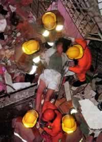 9月21日,救援人员在一栋倒塌的十二层楼房里将一名妇女救出。