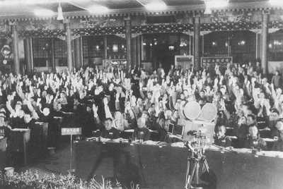 在中国人民政治协商会议第一次全体会议上,代表们以举手表决方式通过议案