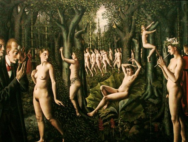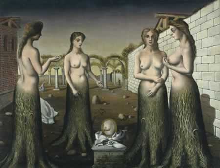 在该时期中,受乔治·德·基里柯和和内·马格利特的双重影响在使他明白自己处境的同时,还促使他加入了超现实主义派.从那以后,他的目的不再是重现外部世界,为它录下真实的形象,而是发掘自身生活深处的亲切、秘密方面.客观现实只有在作为他梦幻的环境时,才会引起他的兴趣.就是在梦幻之中,产生了地点和人物的奇特相遇.无论是它们之间的关系,还是它们的相互对比,都成为往往郁郁不乐的诗歌.庙宇,月亮城,马路或公共广场,无家具的房间,在这些环境中,我们看到同一类型的妇女.她们年青漂亮,时而裸体,时而穿着镶有花边和树叶的衣服,或者大褶长裙.这种人物形象时时萦绕在画家的心头.