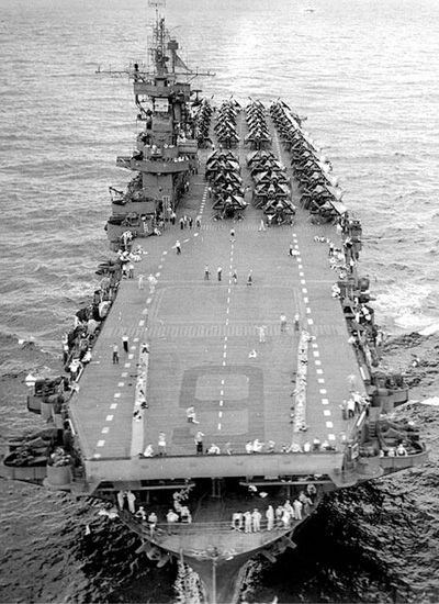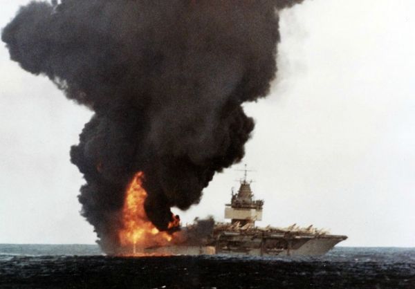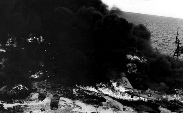 1969年1月14日由夏威夷向越南部署期间,发生意外事故,甲板上的飞机和弹药爆炸引起大火飞行甲板被炸出5个大洞25名船员死亡