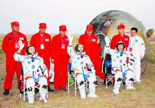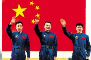 神七飞行的航天员翟志刚(中)、刘伯明(右)、景海鹏