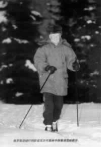 俄罗斯总统叶利钦在瓦尔代森林中踩着滑雪板散步