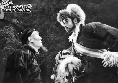 根据杨子荣的事迹改编的电影《智取威虎山》剧照:座山雕(左)与杨子荣
