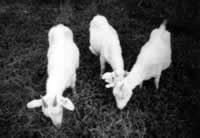三只山羊均为有人凝血因子IX基因整合的转基因,右边一只已进入泌乳期且乳汁含有人凝血因子IX活性蛋白。(已获得五头与人凝血因子IX基因整合的转基因山羊,其中一头已分泌人凝血因子IX活性蛋白)