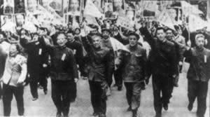 广州各界50多万人举行示威大游行,抗议美国侵犯越南。陶铸(右四)等走在队列前列