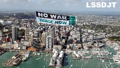 2003年2月15日,一幅写有『不要战争,马上和平』的标语出现在新西兰北部港口城市奥克兰上空。