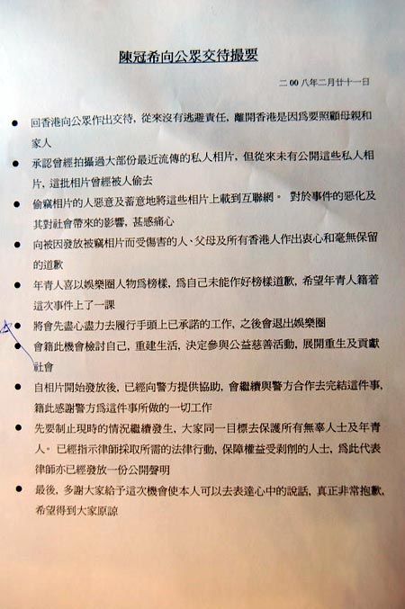 2008年2月21日“艳照门”事件陈冠希声明“退出香港娱乐圈”