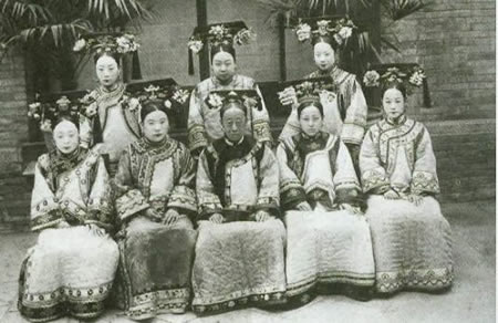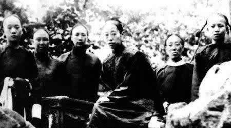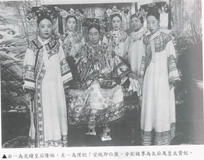 溥仪继位后,静芬被尊为隆裕太后。下面右边照片为她与5个太监摄于假山上的石桌旁,隆裕坐在中间,太监们站在身旁。该照片摄于溥仪登极之后,隆裕太后已是40岁出头的人。她在46岁时去世。