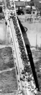 1965年3月7日,美国黑人争取民权的示威游行队伍向州府蒙哥马利进发,途中遭当局阻挡,并用暴力驱散游行队伍,其中一名示威者被杀。由此引发了数万名黑人的抗议游行,要求结束种族歧视。自由大游行的领导者是马丁·路德·金。