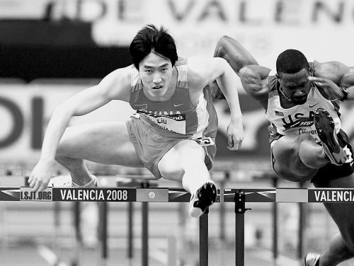 2008年3月8日刘翔在西班牙举行的第12届世界室内田径锦标赛夺冠