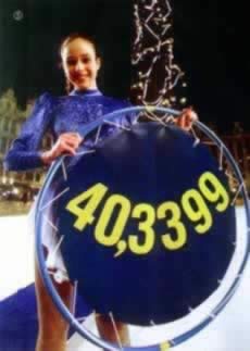 在布鲁赛尔的一个溜冰场上,一名溜冰者手执标有欧元对比利时法郎汇率的圆环