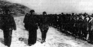 1944年,毛泽东、朱德、王震在延安机场检阅南下的359旅