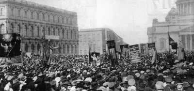 在二月革命与十月革命之间动荡不安的日子里,彼得格勒的一次群众集会被临时政府军队开枪驱散1917年3月15日,俄国临时政府成立。大地主李沃夫任临时政府主席,立宪民主党党魁米留可夫任外交部长,十月党首领古契柯夫