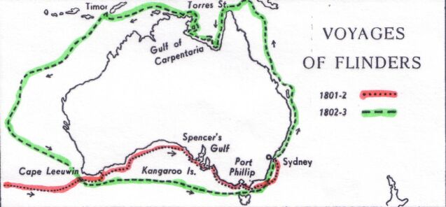 马修·福林达斯航行路径1802年4月8日船队东行途中,巧遇法国探险家尼可拉斯·包丁,他乘船Le Géographe号西行途中,他们都是奉自己国家支持命令探勘未知的澳大利亚南部海岸线绘图,两人还就学理上细节交换研究许多珍贵的发现,最后两队探勘队还一起到雪梨补足物资,福林达斯稍晚还为他们初遇的地方取名作相见湾(不是日本相摸湾).