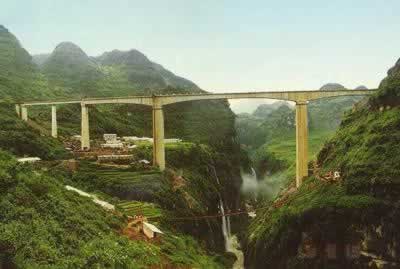 南昆铁路通过的清水河大桥是世界最高的铁路桥,桥墩是国内第一座百米高墩, 主跨128米,在全国干线铁路中跨度最大。黔柱交界处的八渡南盘江大桥被誉为『神州第一桥』, 它在国内铁路桥梁中首先采用了V型支撑新技术。