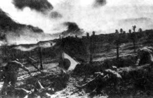 中国士兵用机关枪向轰炸阵地的敌机猛烈射击