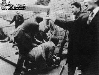 瞬息之间,4人倒下,便衣警察冲上去抓住了枪手1981年3月30日,里根总统在华盛顿希尔顿饭店召开的一次劳工集会上发表演讲,在他返回自己的轿车时遭到枪击,胸部受伤,他的新闻秘书詹姆斯-布雷迪和两名随行军官也受