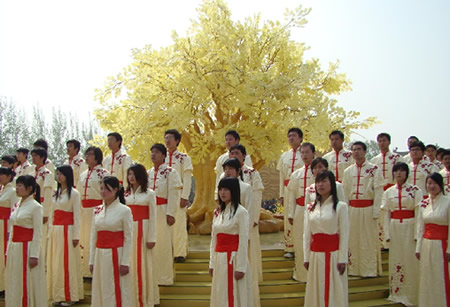10时25分,恢弘的音乐响起,240名成人合唱队、80名少年儿童组成的合唱队齐声高唱《黄帝颂》,著名歌唱家殷秀梅和童星李木子手牵手,在金色的祈福树下共同领唱。