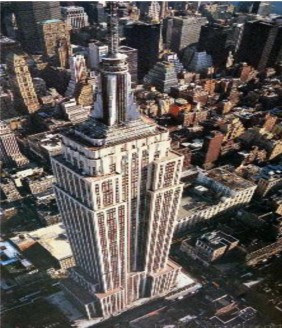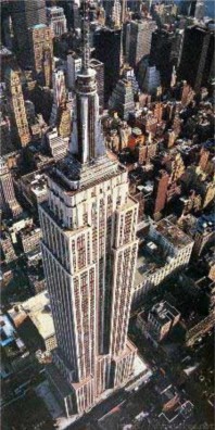 1981年4月30日,矗立在美国纽约市中心高1250英尺、共102层的帝国大厦度过了50个春秋。30年代,美国经济处于大萧条时期,人民生活更加困苦,而华尔街的老板们却热衷于修建摩天大楼的竞赛。百万富翁拉斯科布为了显示自己的富有,决意修建一座世界最高的楼房。他找来著名的建筑师威廉·拉姆,问楼房能盖多高?拉姆沉思片刻后回答说:『1050英尺。』拉斯科布对这个高度很不满意,因为这仅仅比当时纽约新建成的克莱斯勒大厦高4英尺。于是,建筑师设法增加了一节200英尺高的圆塔,使帝国大厦的高度为1250英尺。这座摩天大楼只用了410天就建成,也可算是建筑史上的奇迹。在很长一段时间里,帝国大厦一直是世界最高的楼房。
