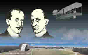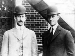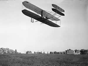 航空百年话航天,图为莱特兄弟100前年驾机飞行。