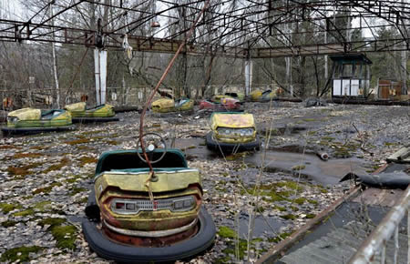 普里皮亚季镇一家游乐场中,满是灰尘的碰碰车已经锈迹斑斑。这个位于切尔诺贝利30公里远的小镇,自从核事故发生以来空无一人。当核事故发生时,前苏联官员并未立即通报灾情,就连普里皮亚季镇的居民也不知道。