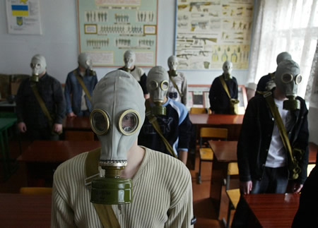 2006年4月3日,乌克兰Rudo地区的学童,带着防毒面具进行核安全演练。