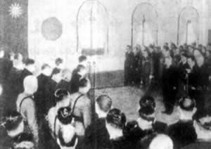 南京汪伪政府举行『庆祝还都典礼』。左侧为汪精卫政府人员,右侧为日本方面之人员。