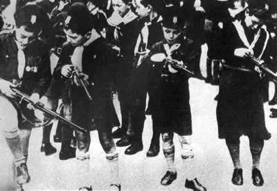 墨索里尼为扩军备战,大力进行军国主义教育。图为法西斯童子军的成员正在接受如何使用步枪的训练。