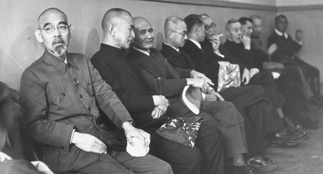 松冈洋右(左一)等战犯等待传讯。这场审判真正的不公正在于:刻意强调日本对欧美的暴行,而忽略东亚所受的灾难。