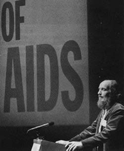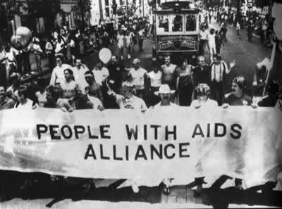 1988年6月26日第13届同性恋者自由日,300,000名艾滋病患者在旧金山举行游行示威。图中条幅上写着:艾滋病患者联合起来6月,另一次会议在斯德哥尔摩召开,来自125个国家的6000多名专家齐聚集一堂。然而,代表们却在这里听到了不妙的消息:尽管有庞大的国际交流研究计划,科学家们仍没有找到治愈办法。有鉴于此,专家们极力主张发起一场运动,使大众对艾滋病有更多的了解,以防止它从高危险人群--同性恋者和通过静脉注射的吸毒者---传布到更广大的人群中。艾滋病主要通过受感染的血液和其他体液进行传布。据估计,1988年全世界大约有500万人成为艾滋病病毒感染者,其中的150,O00人已经发展成为艾滋病患者,专家估计这一数字将在年底前翻番,而且,在未来5年内将有100万人加入发病者行列。尽管非洲被认为是最高发病率地区,但是在已公开的报道中美国患艾滋病的人数最多。针对这一危机,美国设立了一个总统调查委员会,该委员会认可了一份由医生们提供的所有艾滋病患者的机密性名单,并建议各州官员应当将真实情况通知那些患病者的性伙伴。但是这一措施引起了争议。很明显,科学家们远没有找到治疗艾滋病的有效方法,而且在西方,艾滋病造成人们对患此病者和同性恋者的普遍歧视。1990年第六届国际艾滋病大会在旧金山召开,艾滋病患者们举行了有史以来最大规模的集会,并进行了表达他们愤怒的示威游行。旧金山市长用数字生动地描述了问题的严重性,在他的开幕式演讲中,市长宣布:在8O年代,旧金山死于艾滋病的人数是该市在两次世界大战、朝鲜战争和越南战争中所有死亡人数的3倍。