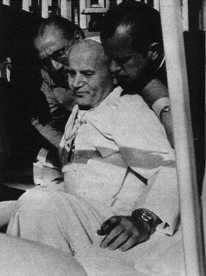 1981年5月13日,教皇约翰-保罗二世被企图暗杀他的刺客击中。当他乘坐一辆敞篷车出现在圣彼得广场一万名礼拜者之中时、一个在逃的土耳其罪犯将他击伤。曾两次腹部中弹的教皇正对教徒们进行每周一次的说教。