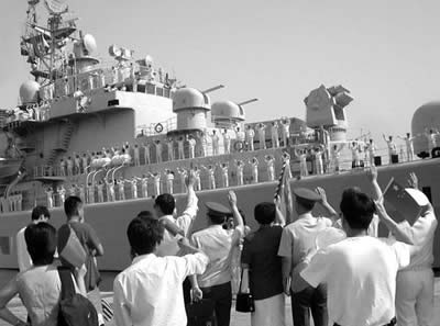 2002年5月15日,由中国自行设计制造的『青岛』号导弹驱逐舰和『太仓』号综合补给舰组成的中国海军舰艇编队从青岛起航,首次进行环球航行,历时4个月。人民海军舰艇编队这次环球航行访问,横跨印度洋、太平洋、大西洋,远涉亚洲、非洲、欧洲、南美洲和大洋洲,先后对10个国家和港口进行了友好访问,总航程33000多海里,途经14个主要海峡和苏伊士、巴拿马运河,横跨68个纬度,6次穿越赤道,创造了人民海军舰艇编队出访时间最长、航程最远、航经海域最广、访问国家最多等纪录。新华社发(资料照片)