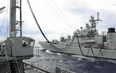 这是2002年6月2日,『太仓』号综合补给舰在印度洋中部海域成功地为『青岛』号导弹驱逐舰补给燃油181吨、淡水50吨。