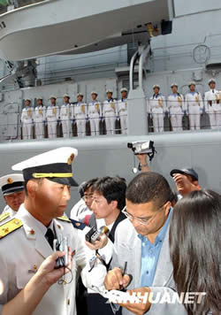 这是编队总指挥、时任海军北海舰队司令员的丁一平将军(左)在埃及亚历山大港接受当地记者采访。