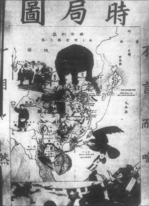 一位爱国人士画的时局图熊代表沙皇俄国,虎代表英国,肠代表德国,哈蟆代表法国,太阳代表日本国,鹰代表美国