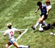 在阿根廷队同英格兰队的一场复赛中,马拉多纳的两个进球为世界杯赛历史所铭记:他先是借助『上帝之手』把球送入英格兰队的大门,成为最有争议的进球;而后他带球连续晃过5名防守队员,把球射入空门,这一入球被列为最精彩进球。