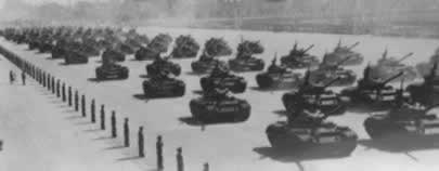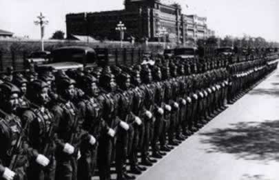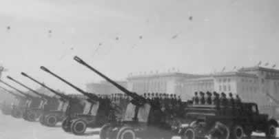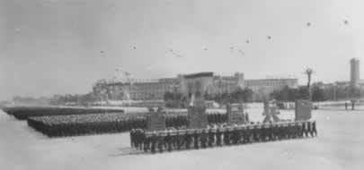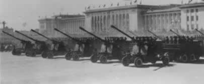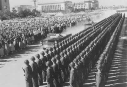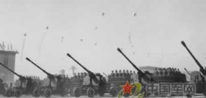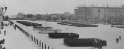 1959年10月1日,天安门广场上隆重举行中华人民共和国成 立十周年阅兵式。迎风招展的八一军旗引导着军 事学院和步兵、 炮兵、工程兵、坦克兵、航空兵、铁道兵、海军等学校的队伍, 首先进入广场。受检阅各部队的装备中,最新式的自动步枪、大 炮、坦克、高速度喷气式歼击机等,都是中国制造的。保卫祖国 万里海疆的海军队伍当中,有击沉 、击伤敌舰船一百多艘并俘获 50艘的东海舰队水兵;有来自福建前线的水兵,他们曾在1958年 秋天的两个月里把二 十多艘蒋军舰艇埋葬在台湾海峡。人民海军 已经是一支拥有大量舰艇、潜艇和海军航空兵、海岸炮兵等等兵 种的强大海防 力量。装备精良的步兵、各摩托步兵和空降兵等部队,表现了高度 的训练水平。炮兵勇士驱车牵引着144门各种口 径的远射程大炮, 其中有自动化高射炮和大口径加农炮。新型坦克有各种最新式的 技术装备和强大的火力,155加喷气 式轰炸机和歼击机发出雷鸣 般的吼声一闪而过。