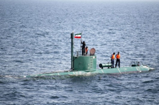 2011年12月27日,伊朗海军的一艘微型潜艇在安曼湾演习中升起一面伊朗国旗。
